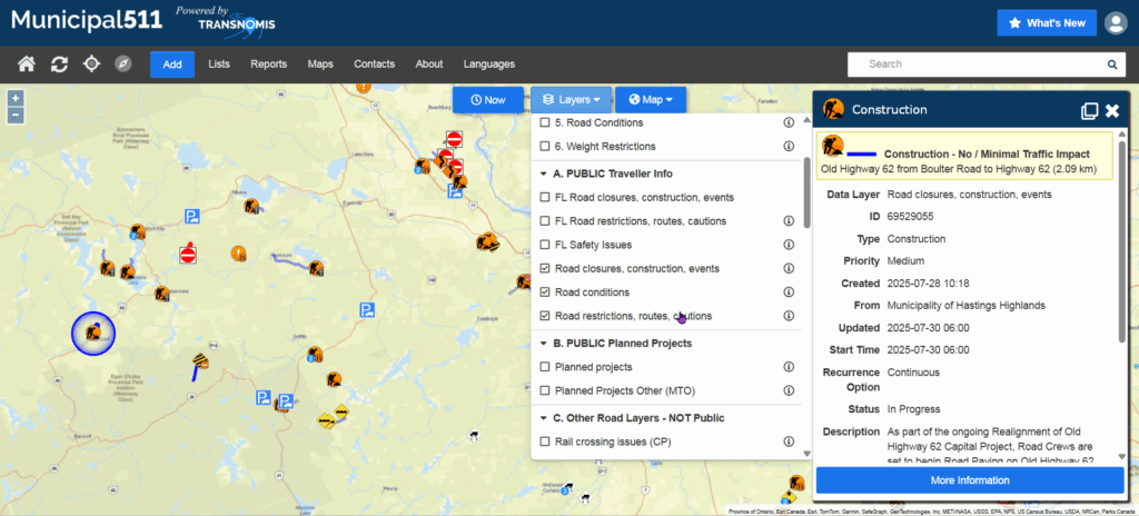 Municipal 511 is a public-facing and agency-coordination map platform that displays road events, closures, restrictions, and infrastructure conditions. The Esri-enabled version enhances data accuracy, consistency, and interoperability across agencies.